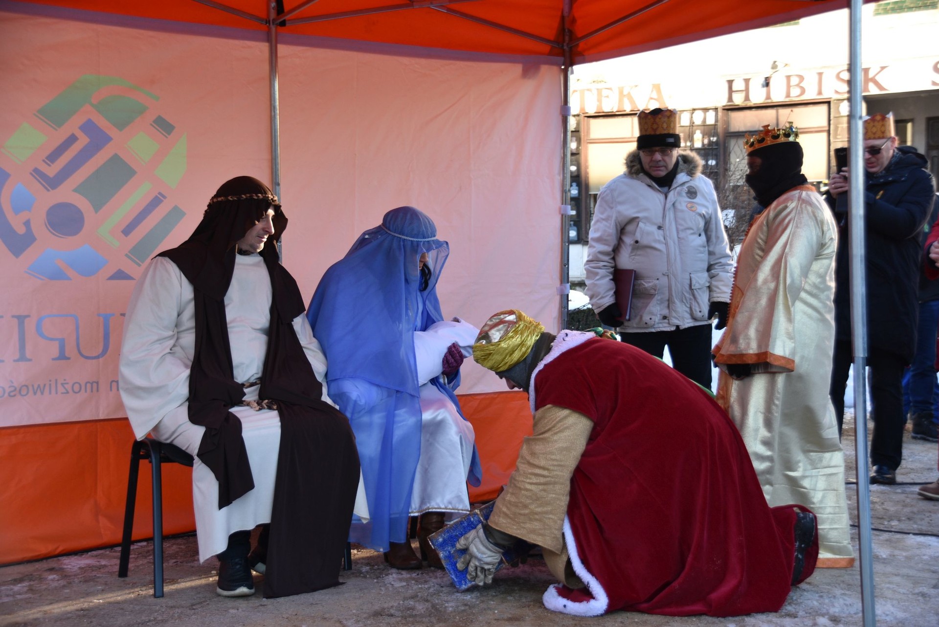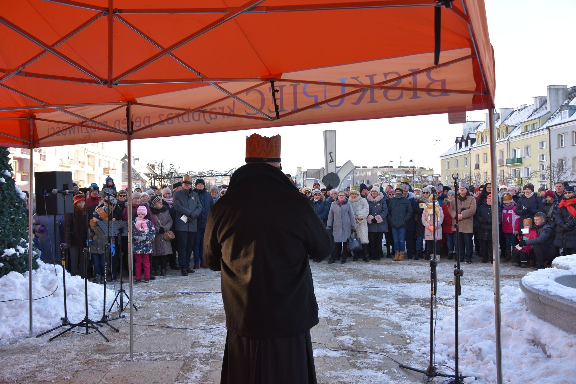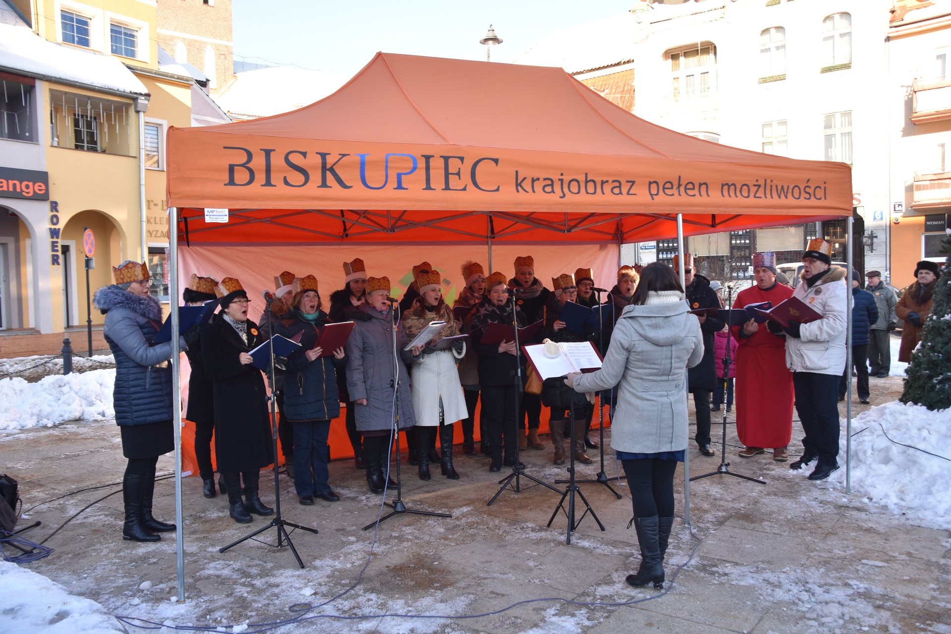 W święto Objawienia Pańskiego około godz. 13 na Placu Wolności pojawili się konno Trzej Królowie. Dołączyła do nich Święta Rodzina, która wsiadła za nimi do bryczki. Dla najmłodszych przygotowano powóz ciągnięty przez konie. Kilkuset wiernych, którzy wyszli z kościołów pw. św. Jana Chrzciciela i bł. Karoliny ruszyło w orszaku ulicami Biskupca. Śpiewano kolędy, wiele osób miało na głowach papierowe korony. Gdy orszak wrócił na Plac Wolności, królowie oddali pokłon Dzieciątku Jezus i rozpoczął się koncert kolęd śpiewanych przez chór CKTiS. Strażacy-ochotnicy częstowali gorącą herbatą, przygotowano także darmową gorącą zupę.