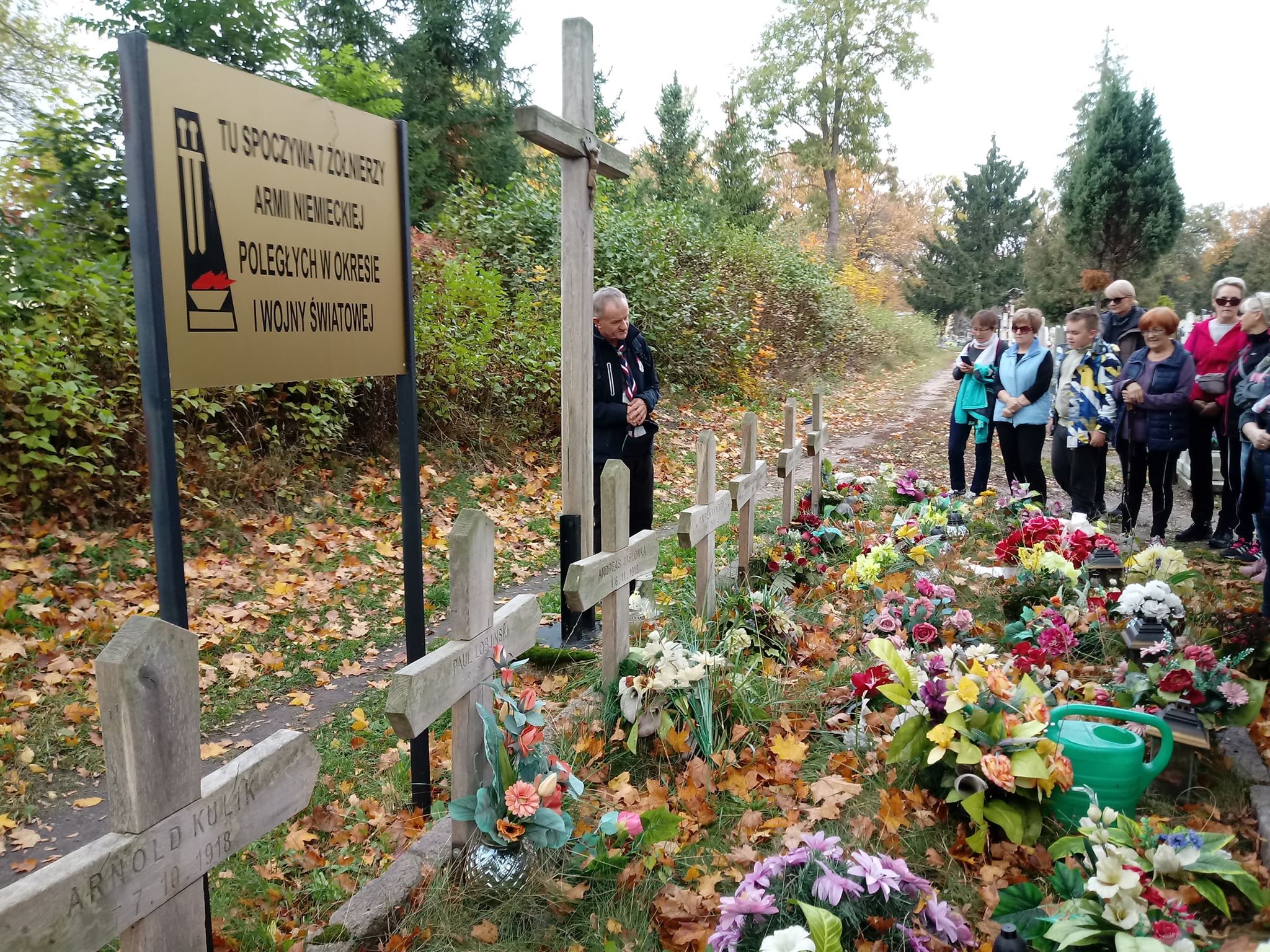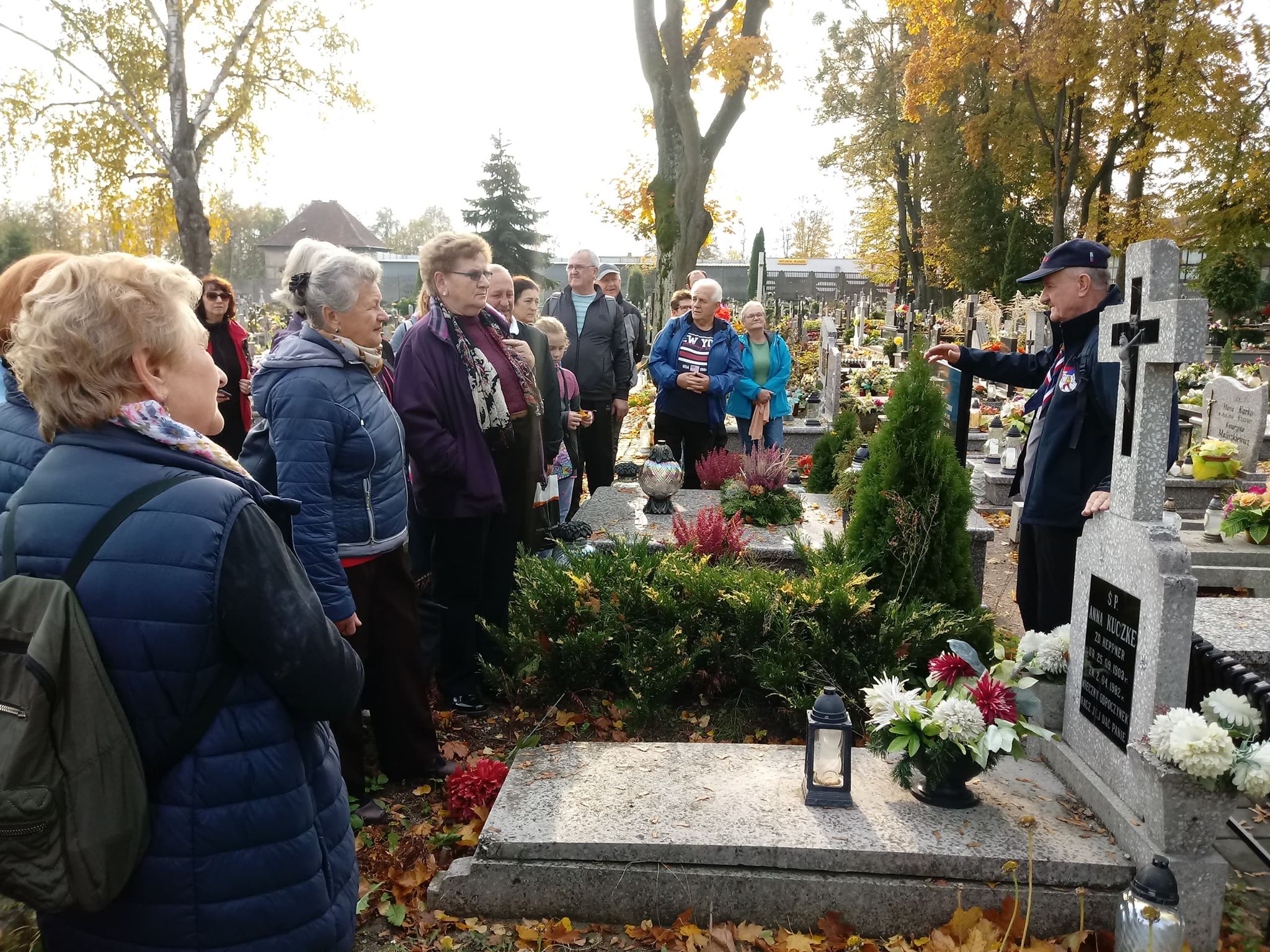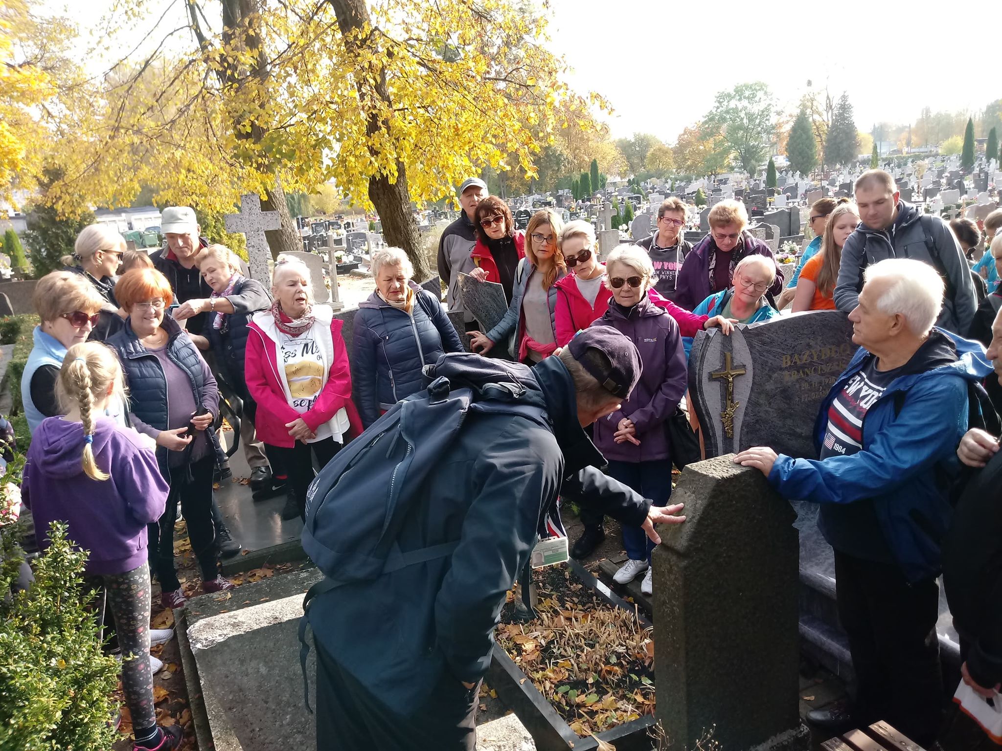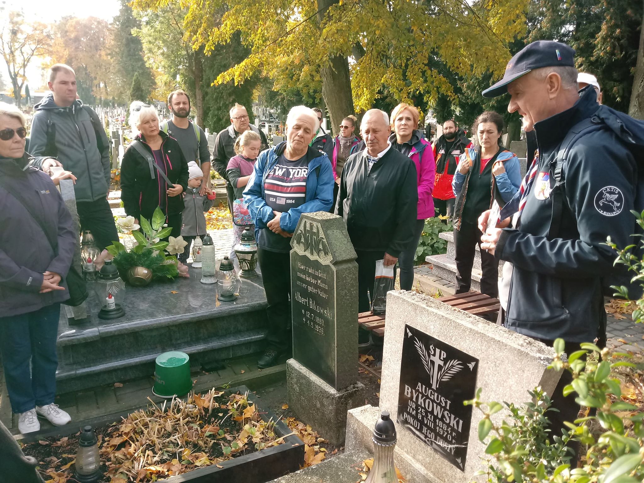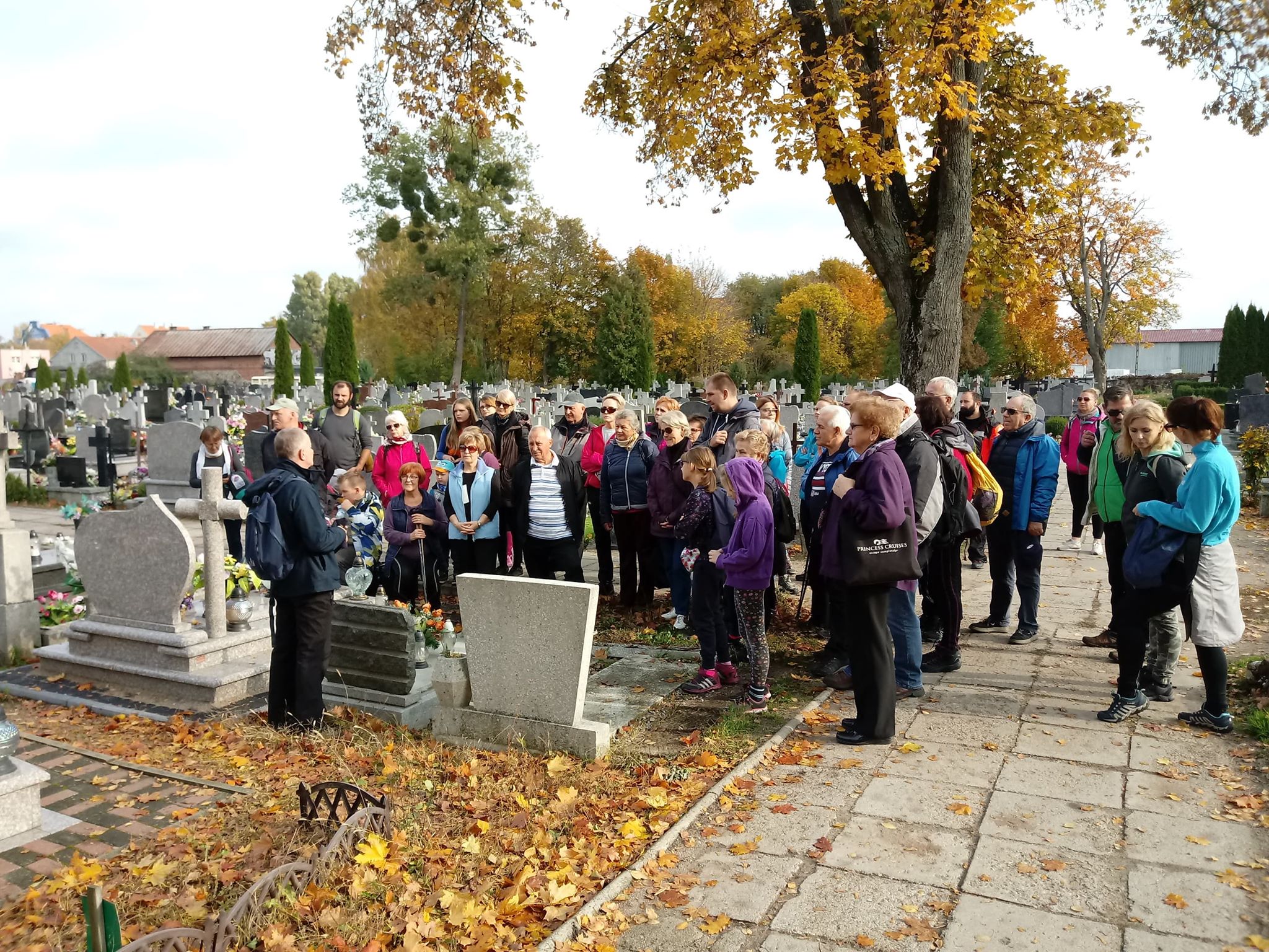 Uczestnicy rajdu spotkali się z przewodnikiem PTTK, pracownikiem CKTiS Krzysztofem Kowalskim jak zwykle punktualnie o godz. 10 przy Przystani Warmińskiej. Stamtąd wyruszyli najpierw na spacer po Biskupcu. W związku ze zbliżającym się Świętem Zmarłych odwiedzili m.in. cmentarz komunalny. Tu przewodnik wskazał miejsce pochówku wybitnych postaci związanych z Biskupcem, ale także groby żołnierzy z okresu I wojny światowej, czy miejsca spoczynku osób, których losy dobrze ilustrują zmieniającą się sytuację historyczno-polityczną tych ziem.