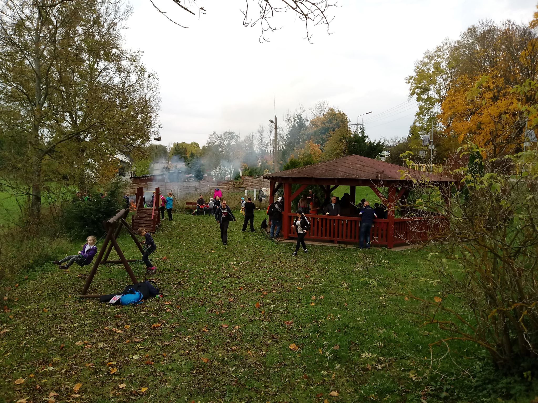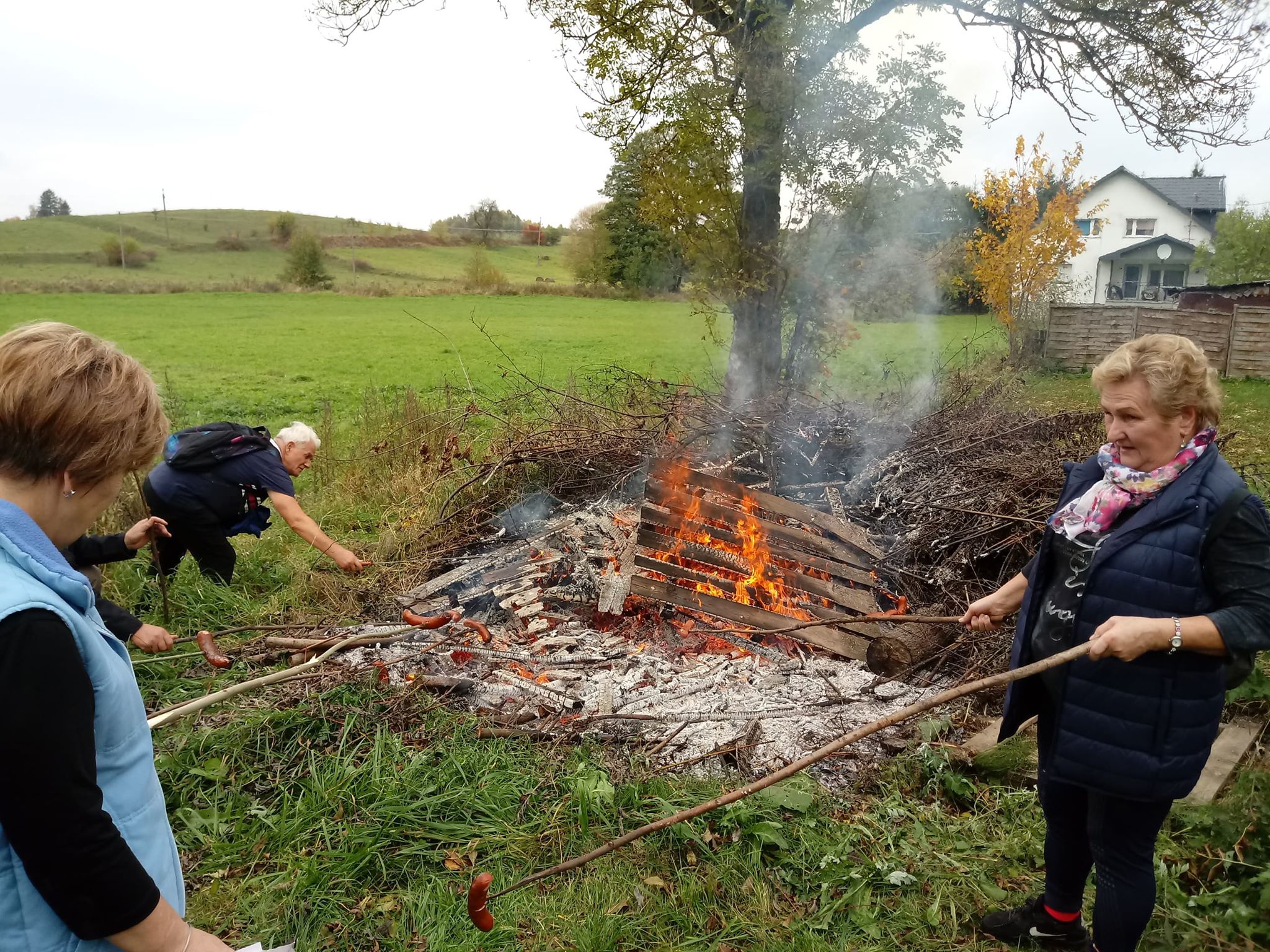 Dalej uczestnicy wycieczki ruszyli polnymi drogami w stronę Rukławek podziwiając mijane krajobrazy. Choć droga była miejscami trudna, wszyscy dali radę ją pokonać, by spotkać się przy ognisku z kiełbaskami przygotowanym w Rukławkach. Dzięki gościnności sołectwa atmosfera przy „grzybku” zrobiła się bardzo rodzinna i gdy tylko wszyscy posili się rozpoczęło się wspólne śpiewanie piosenek turystycznych.